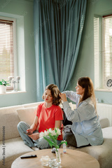 Two friends relax in a bright living room while one styles the other's hair. They sit comfortably on a sofa, surrounded by natural light and greenery, enjoying their time together.