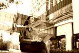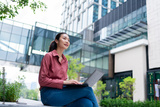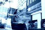 Successful asian business woman using phone outdoors.Happy businesswoman holding cellphone using smartphone or mobile phone standing or walking on city urban street,5g communicating with a colleague.