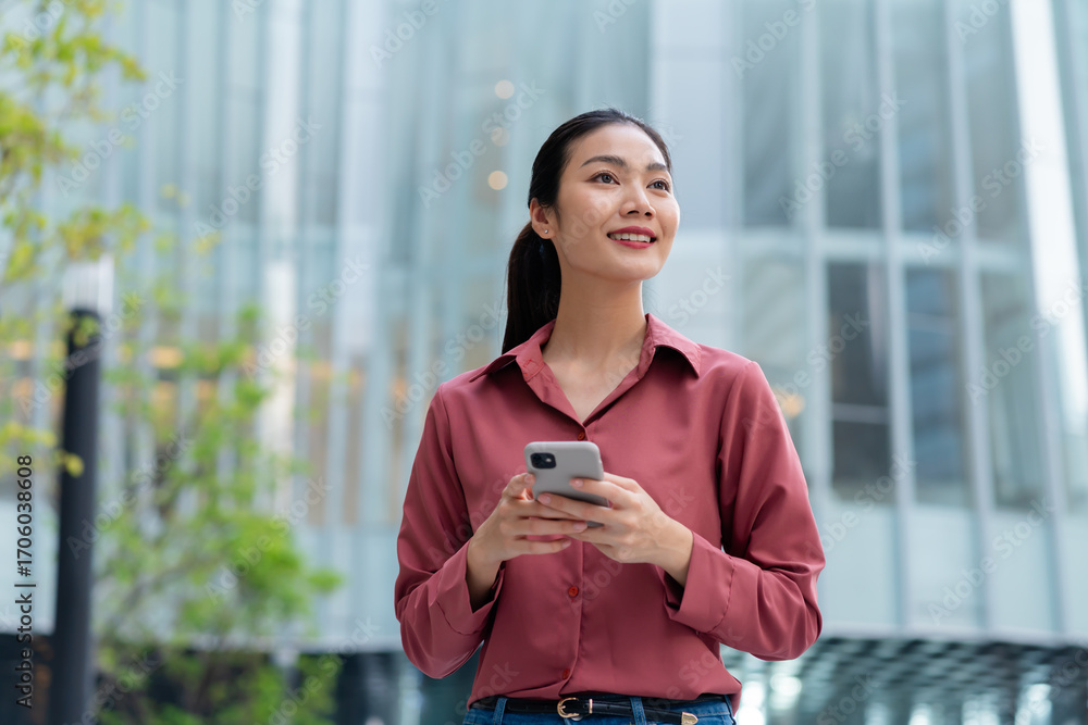 Successful asian business woman using phone outdoors.Happy businesswoman holding cellphone using smartphone or mobile phone standing or walking on city urban street,5g communicating with a colleague.