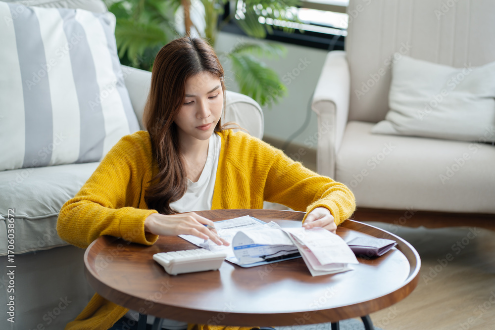 stressed woman trying money to pay credit card debt and worry by calculate expense from invoice or electricity bill,water bill not able money to pay mortgage.debt,loan,bankruptcy,Bad financial concept