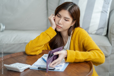 stressed woman trying money to pay credit card debt and worry by calculate expense from invoice or electricity bill,water bill not able money to pay mortgage.debt,loan,bankruptcy,Bad financial concept