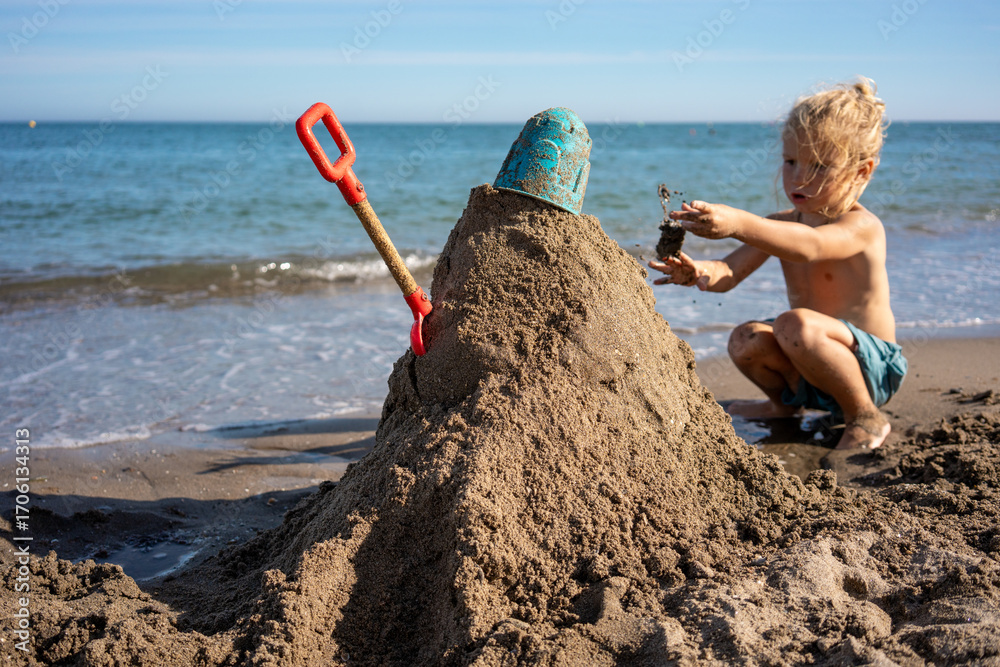 Blond boy in blue shorts building a large sandcastle on the beach with a red shovel stuck in the sand and a blue bucket placed on top near the ocean waves