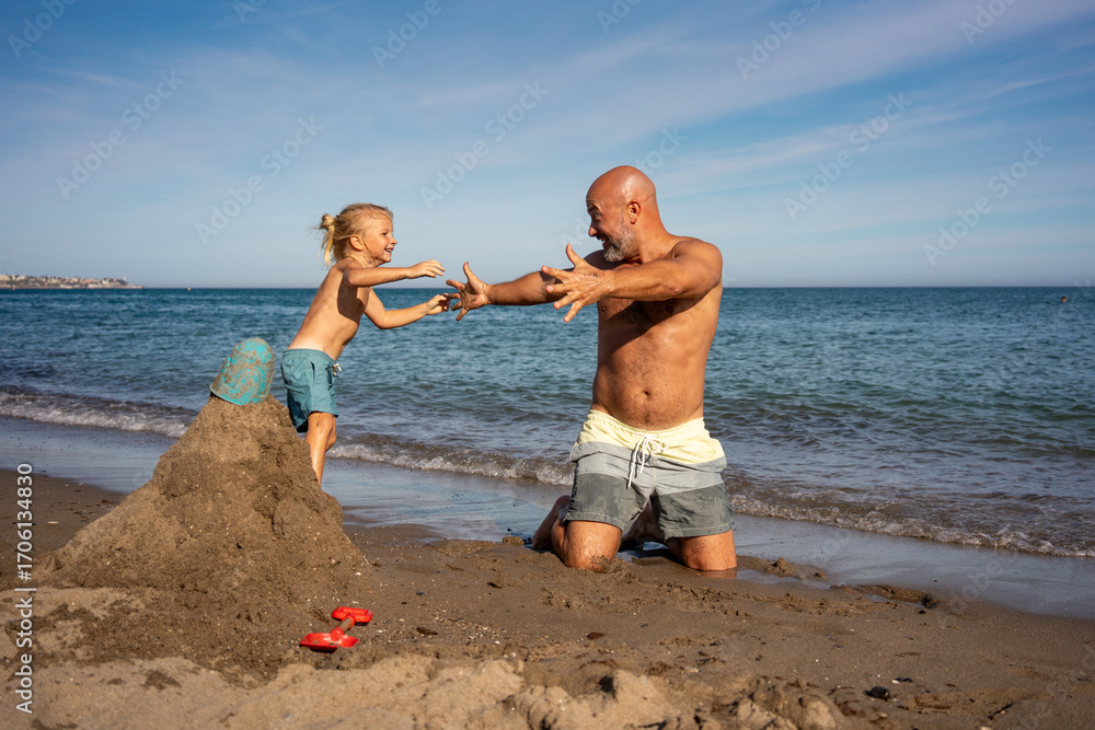 Joyful father and son playing together on the beach near a sandcastle, smiling and reaching for each other with the sea and blue sky in the background
