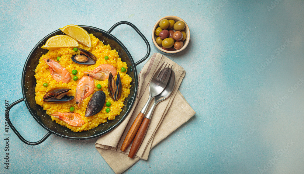 Seafood paella with rice, shrimp, mussels, peas, and lemon wedges served in a black traditional pan on a dark rustic background with olives and cutlery, Mediterranean meal, copy space