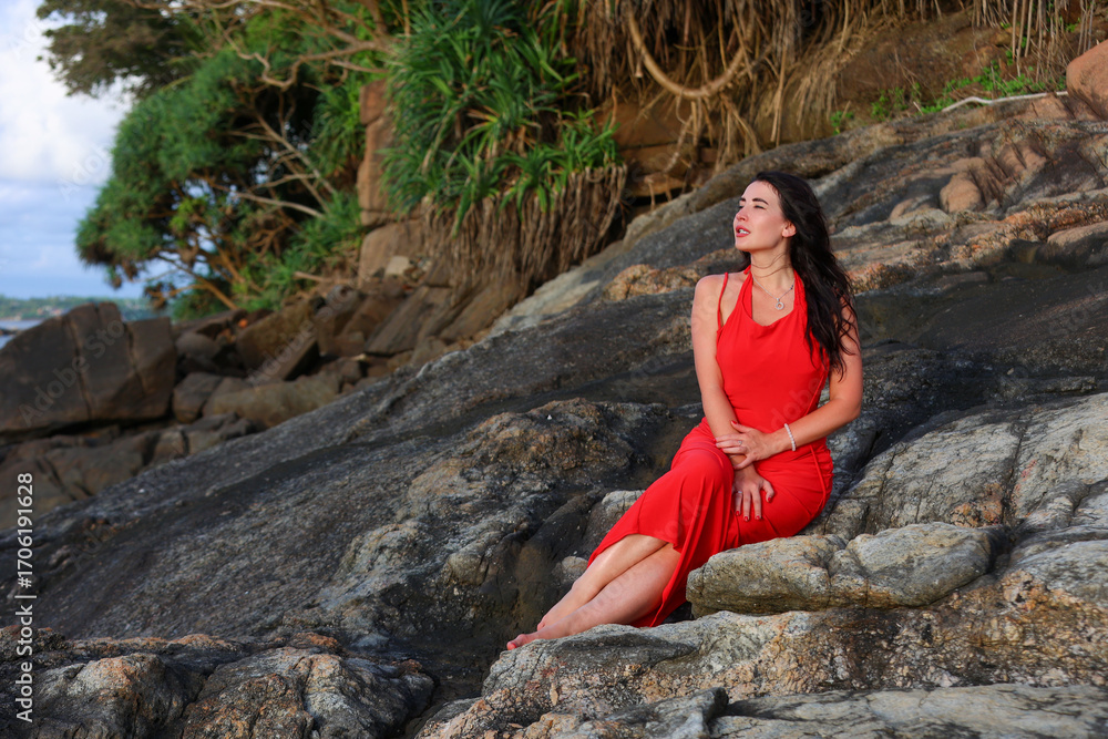 Woman in Red Dress on Rocks by the Sea