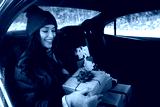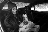 Excited lady sitting on back seat of car with gift boxes, preparing for Christmas holidays and enjoying festive winter mood