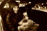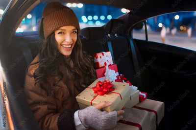 Excited woman preparing for winter holidays, sitting with Xmas gift boxes on back seat of car and smiling at camera