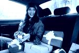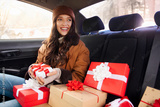 Smiling lady sitting in car on back seat with Christmas gift boxes, going to congratulate friends and relatives on the eve of winter holidays