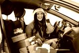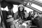Happy lady in Santa hat delivering Xmas presents, sitting in car on drivers seat with lots of gift boxes on passenger seat, woman smiling at camera