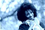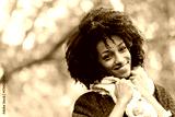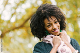 Black cheerful woman portrait wearing warm scarf in autumn season at the park.