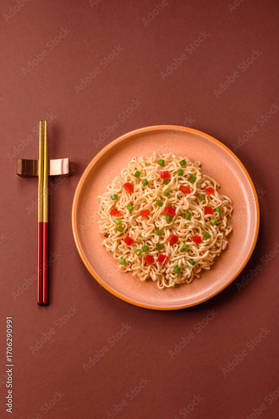 Asian food, chinese or thai rice noodles with vegetables and meat. Rice noodles