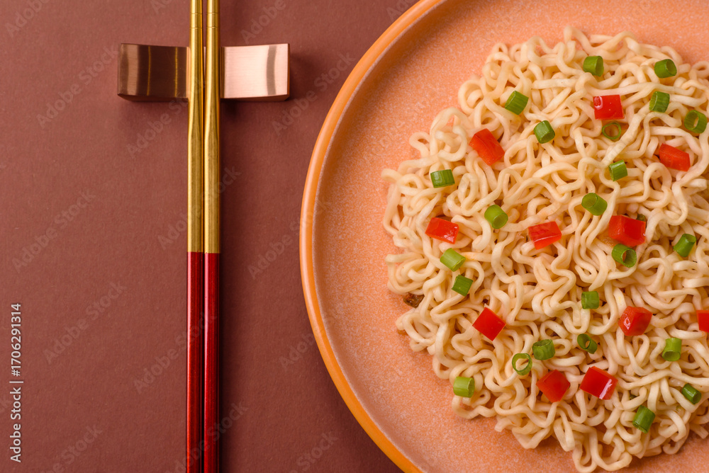 Asian food, chinese or thai rice noodles with vegetables and meat. Rice noodles