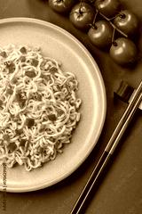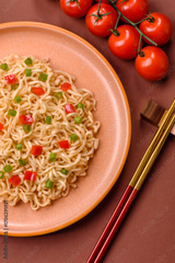 Asian food, chinese or thai rice noodles with vegetables and meat. Rice noodles
