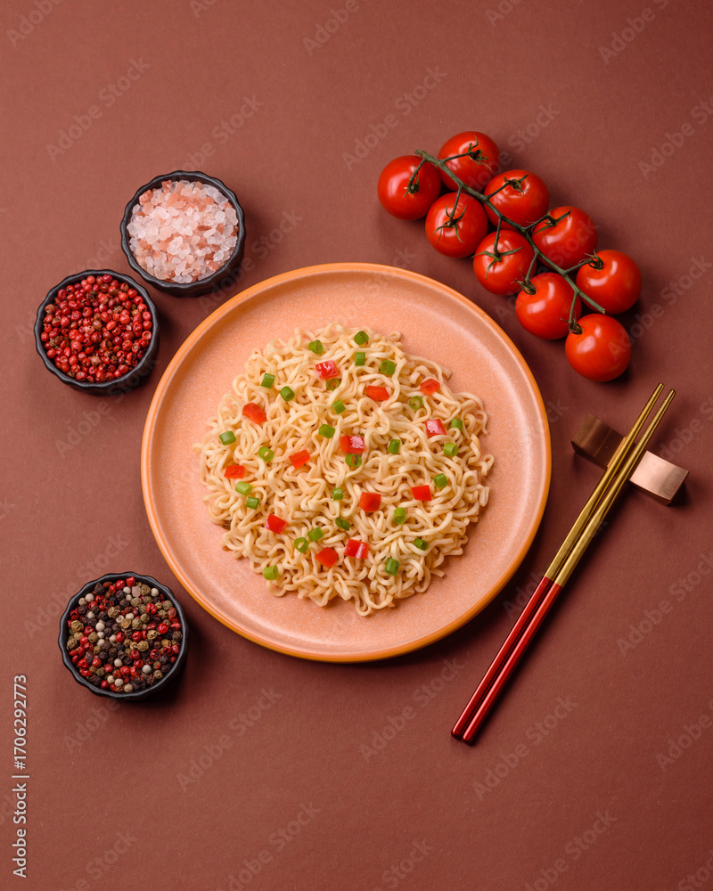 Asian food, chinese or thai rice noodles with vegetables and meat. Rice noodles