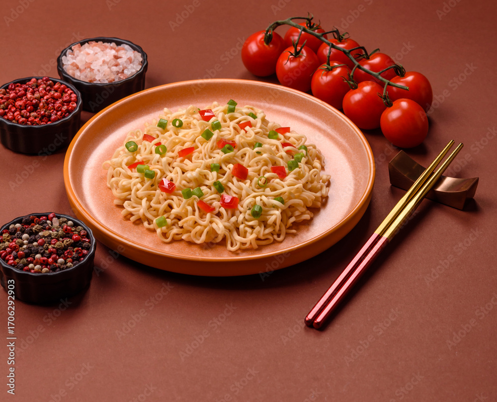 Asian food, chinese or thai rice noodles with vegetables and meat. Rice noodles