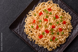Asian food, chinese or thai rice noodles with vegetables and meat. Rice noodles