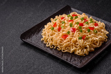 Asian food, chinese or thai rice noodles with vegetables and meat. Rice noodles