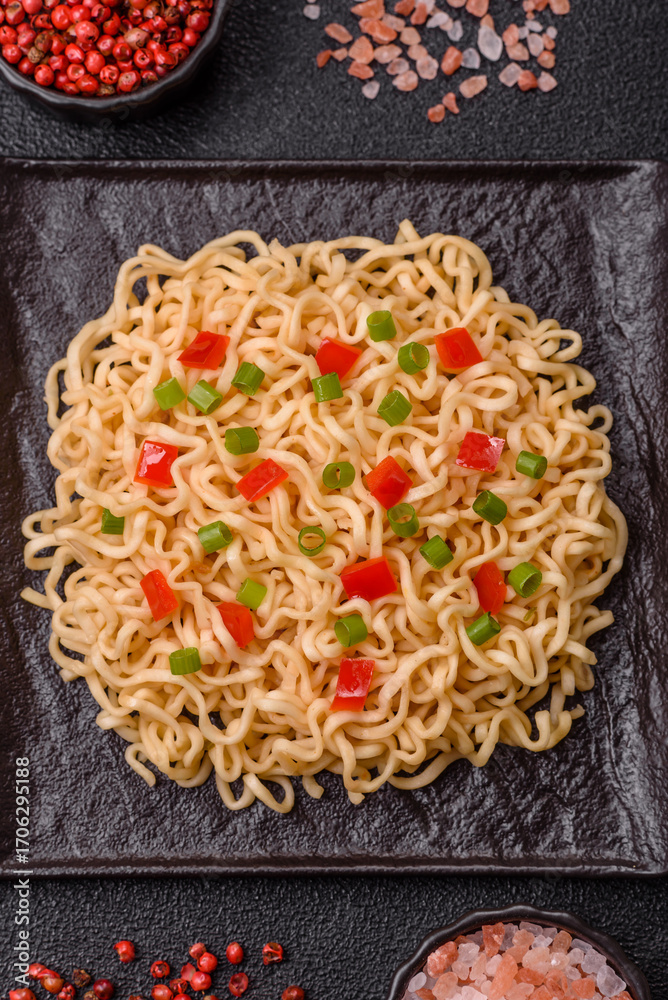 Asian food, chinese or thai rice noodles with vegetables and meat. Rice noodles