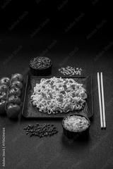 Asian food, chinese or thai rice noodles with vegetables and meat. Rice noodles