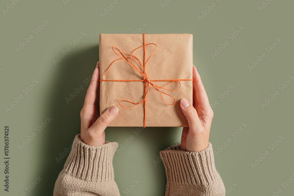 Autumn and winter vibes, Thanksgiving day, winter holidays present, seasonal sale concept. Woman holding handcrafted gift box. Fall composition