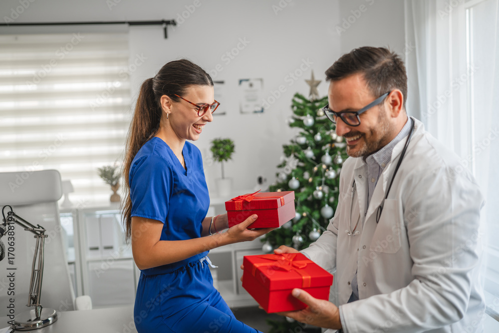 Doctor and nurse exchanging christmas gifts in hospital room
