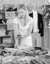 Young woman scans QR code and label of trousers or shorts using mobile phone camera. Customer client is interested in country of origin of product, checks certificate on consumer protection website..