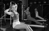 During workout, young woman in sitting position on box set pilates reformer, perform body up and down tilts. Training using adjustable pilates exercise equipment reformer