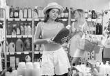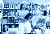 Young girl chooses detergent at home goods store, while in the background shoppers browse products