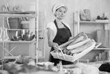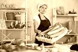 Adult woman baker in uniform holding basket with fresh baguettes in bakery