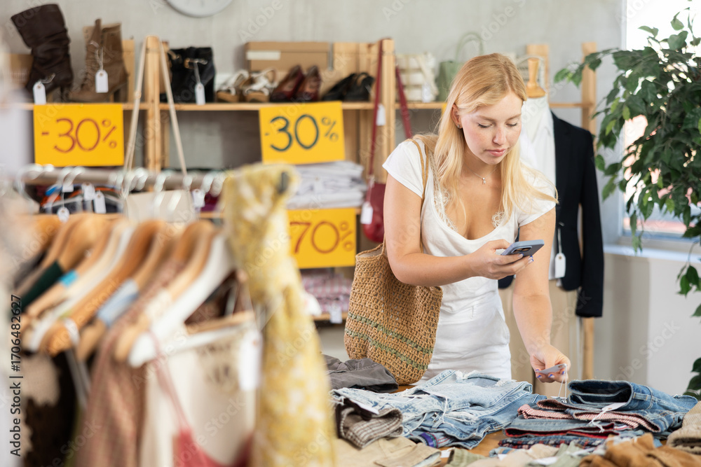 Young woman scans QR code and label of trousers or shorts using mobile phone camera. Customer client is interested in country of origin of product, checks certificate on consumer protection website..