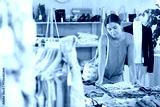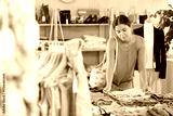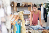 Young woman has come to a European clothing store, she is standing near counter and choosing pants and trousers among the clothes. Woman on shopping in the mall