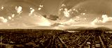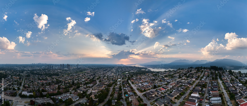 Panoramic Aerial View of Burnaby Skyline at Sunset with Dramatic Clouds