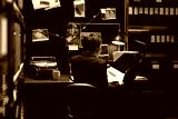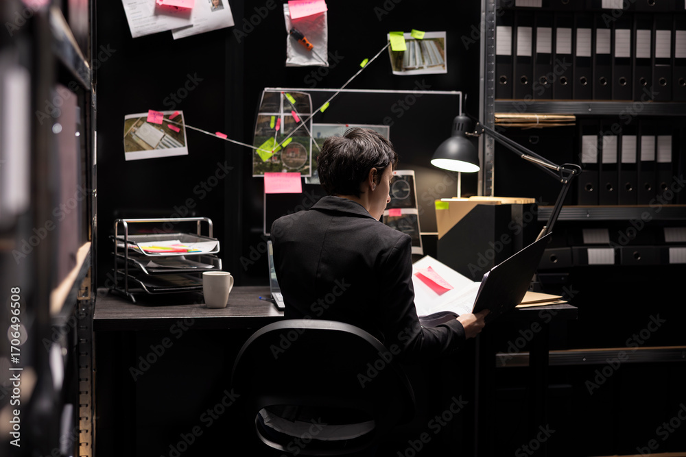 Woman law officer gathering intelligence for a secret operation case, linking photos and classified documents on a board while tracing illegal activity and pursuing a suspect in criminal case.