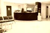 Modern hospital lobby with empty seats for patients and families awaiting appointments or consultations. Vacant front desk and waiting room in medical diagnostic clinic setting.