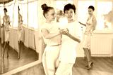 Couple of positive interested teenage dancers, boy and girl preparing for performance, rehearsing ballroom dance in spacious classroom while female teacher observing from background..