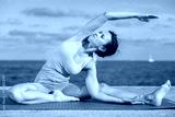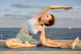 Experienced female fitness trainer performing yoga parsvottanasana sitting on mat on beach