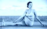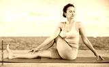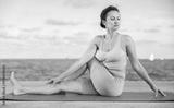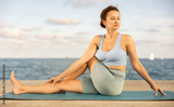 Woman performing Ardha Matsyendrasana position yoga training on beach