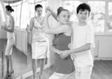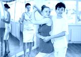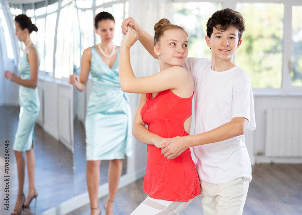 Passionate teen dancers, girl and boy practicing ballroom dancing in dance studio, gracefully performing waltz while female trainer monitoring technique and progress..