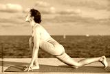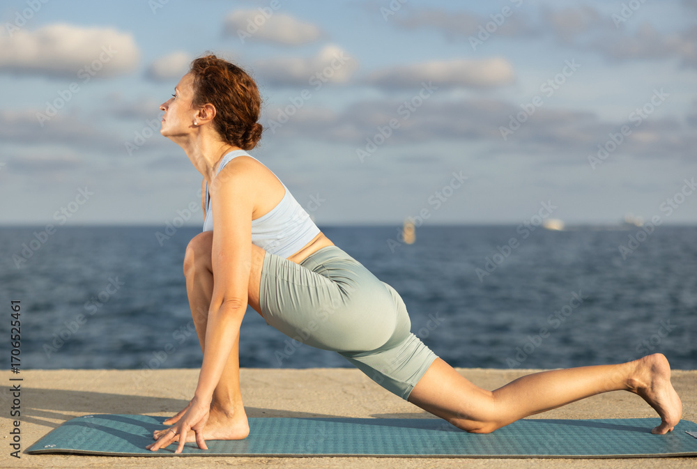During street workout, yoga practice on embankment, female athlete fulfil carry out crescent moon pose, Anjaneyasana