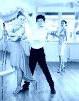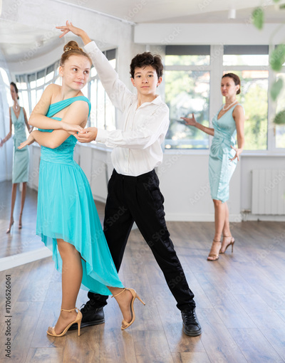 Motivated adolescent ballroom dancers, girl and boy in performance outfit practicing elegant dance moves in pair in bright studio, with female coach supervising in background