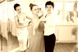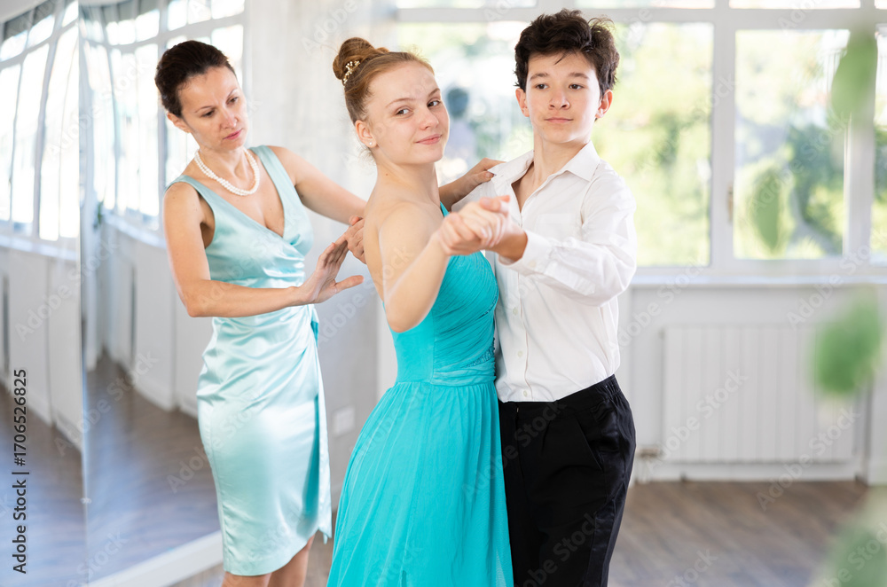 Girl and a boy in festive clothes learn to dance tango under guidance of a teacher