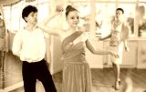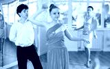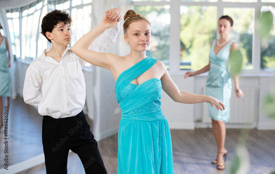 Young couple of teenagers in evening dresses are learning to dance an polonaise dance