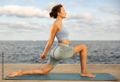 During street workout, yoga practice on embankment, female athlete fulfil carry out crescent moon pose, Anjaneyasana