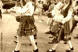 Girls in Bulgarian folk costumes walking and scattering rose petals. City parade with Bulgarian women in embroidered dresses, traditional outfits carrying baskets of roses petals