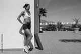 Smiling fit woman in sportswear standing outdoors on terrace with yoga mat against white wall, showing toned legs and abs, concept of fitness, motivation and healthy active lifestyle