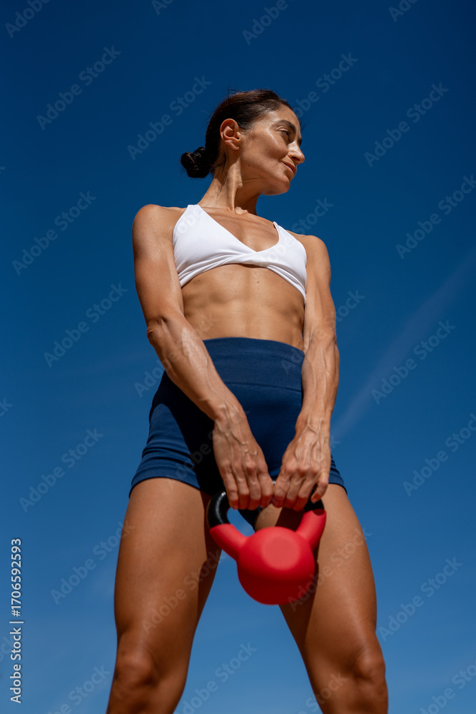 Strong athletic woman training with red kettlebell outdoors, toned abs and muscular arms in sportswear against clear blue sky, symbol of fitness, power, discipline and healthy lifestyle