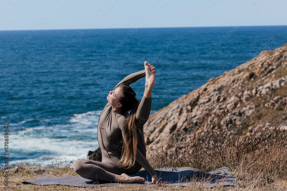 Woman practicing yoga on a mat by the ocean, stretching gracefully with a serene expression, embodying tranquility and mindfulness in a natural setting