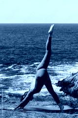 Woman practicing yoga in a downward dog pose on a mat by the ocean, showcasing flexibility and tranquility in a serene coastal environment with clear blue skies