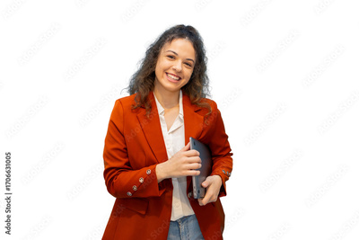 Smiling professional woman holding laptop, standing confidently against transparent backdrop, ready for seamless graphic design incorporation