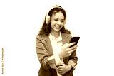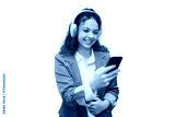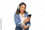 Professional woman listening to music, wearing wireless headphones, working on smartphone against clean white backdrop